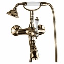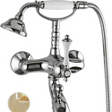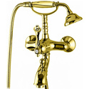 Назначение: ванна+душ • Конструкция: однорычажный • Монтаж: вертикальный • Материал: покрытие - золото • Подводка: жесткая • Монтажные отверстия: 2 отверстия • Форма излива: традиционная • Душевая лейка в комплекте: есть • Держатель для душевой лейки: на смесителе • Донный клапан в комплекте: есть