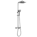 Устройство: душевая система • Смеситель: термостатический • Ручная лейка: размер 110 мм, настройки 3 шт • Верхний душ: размер 250 мм, настройки 1 шт • Комплектация: ручной душ, смеситель, стойка, шланг, крепление ручного душа, полка