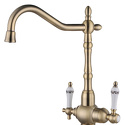 Назначение: кухонный • Конструкция: однорычажный • Монтаж: горизонтальный • Материал: покрытие - бронза • Монтажные отверстия: 1 отверстие • Форма излива: традиционная • Душевая лейка в комплекте: нет • Донный клапан в комплекте: есть